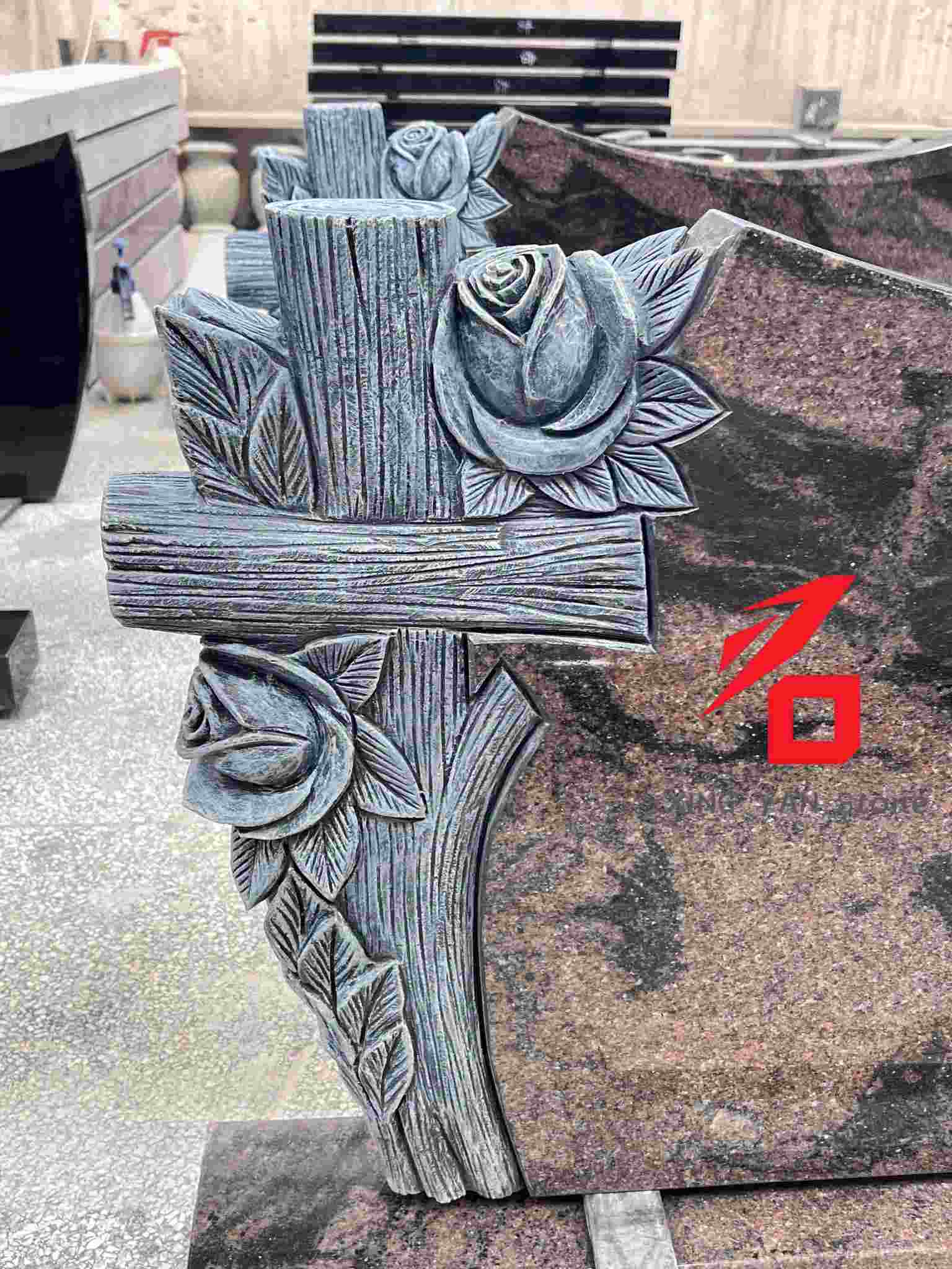 Мастерство: используется техника трехмерного рельефа: крест имеет текстуру древесины, а узоры роз и листьев тщательно изображены. Декор и резьба по основному камню органично интегрированы, обеспечивая структурную стабильность.